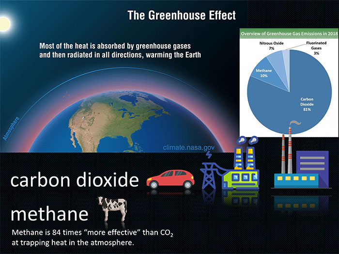 The factory production of meat and dairy has a huge impact on greenhouse gas emissions. Cattle produce enormous amounts of methane; forests are destroyed to create grazing land, removing natural carbon sinks; and meat and dairy are processed and transported large distances in ways that add to the carbon footprint.